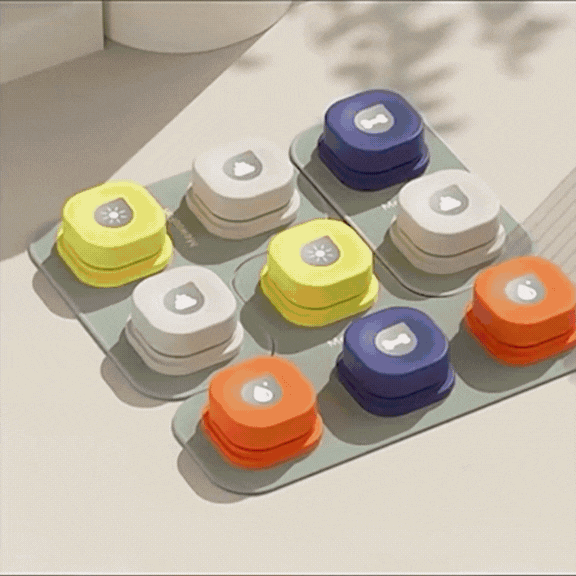 Each button records a 30-second phrase and re-records unlimited times. Start with 4–8 buttons, expand modularly to 12+. Most homes settle at 6–10 words. Pro tip: avoid teaching “walk” at 11 p.m. unless pajamas count.